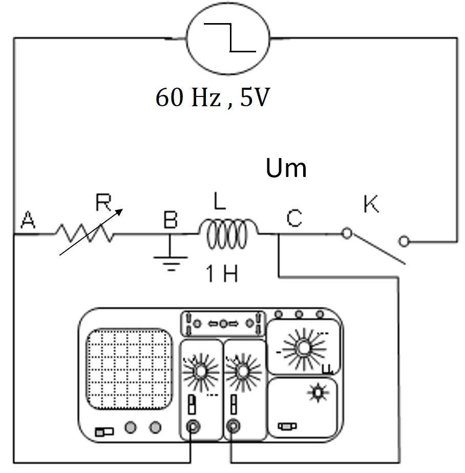 نحقق الدارة كما هو موضح في الشكل ونربط النقطة المشتركة بين الوشيعة و المقاومة بالأرضينستخدم في هذه الحالة وشيعة ذاتيتها $$\bf{L=1H}$$لا ننسى قلب المنحنى$$\bf{-u_R(t)}$$الذي يعرضه الراسم وذلك باستعمال الخيار invert (open)نغير قيمة المقاومة و نرى أثر ذلك على المنحنيات